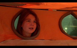 Un théâtre sans corps, sans scène ni salle — juste une tente légère aux parois orangées, percée de visages curieux.